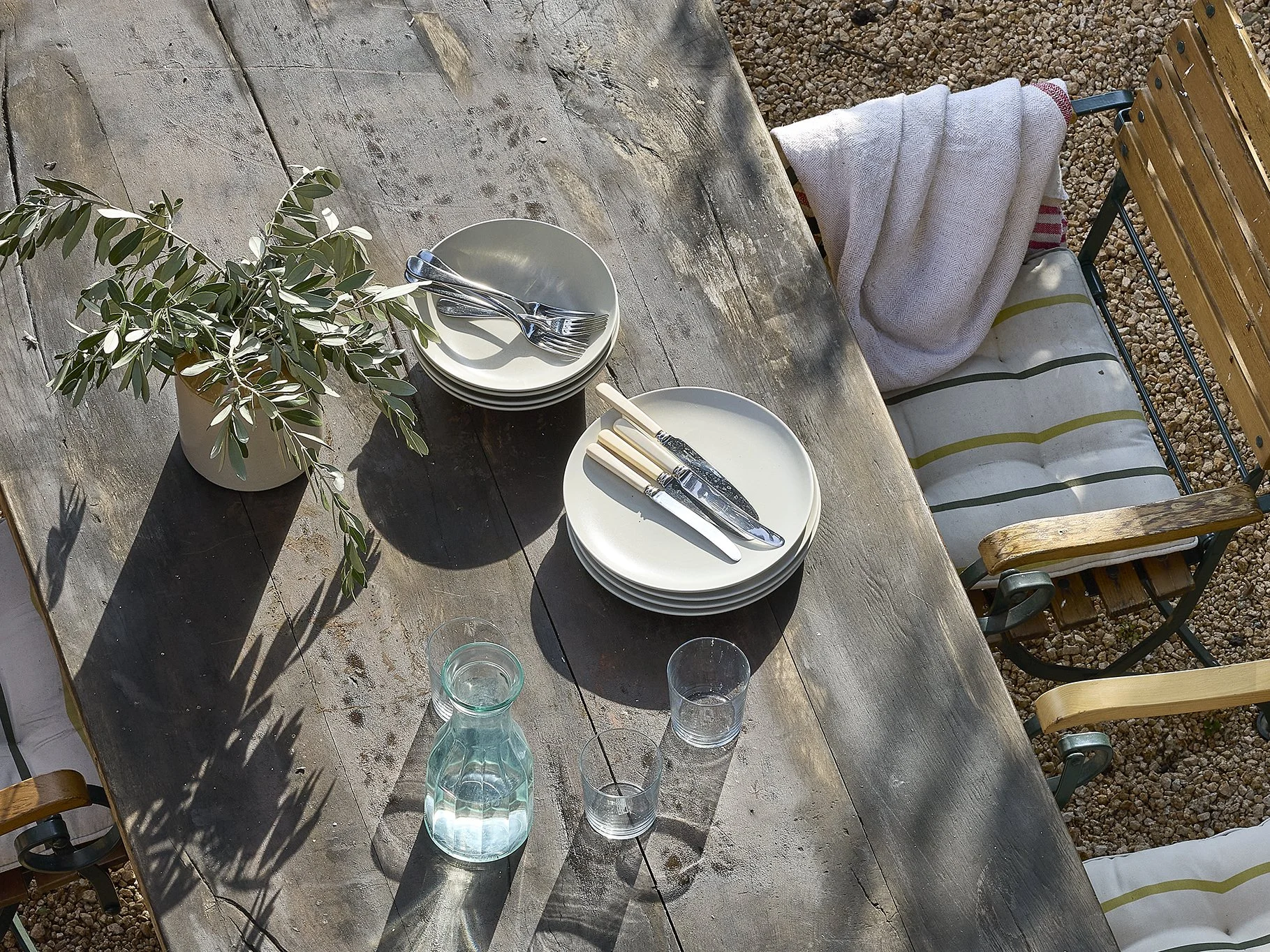Down again to the large eating terrace and BBQ area. This table sits eight. This is serviced by the summer kitchen, which avoids carrying plates and glasses, knives and forks up and down from the main kitchen.