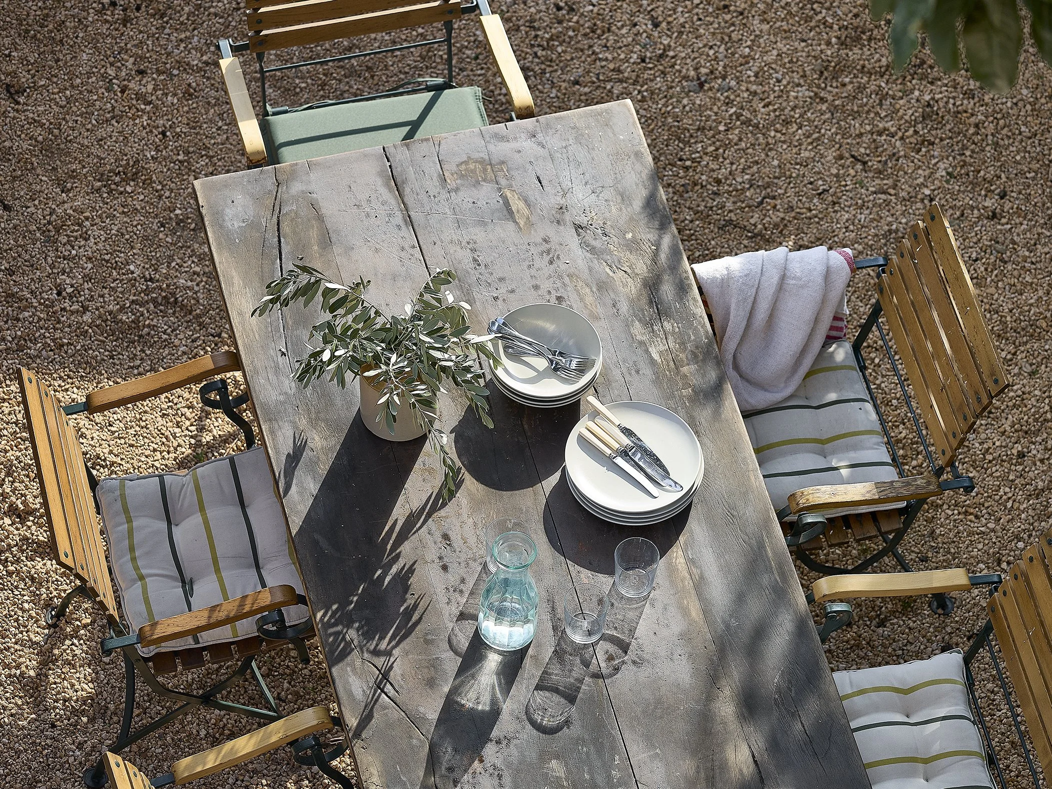 The highest level is an eating terrace looking across the garden with a table that sits six.