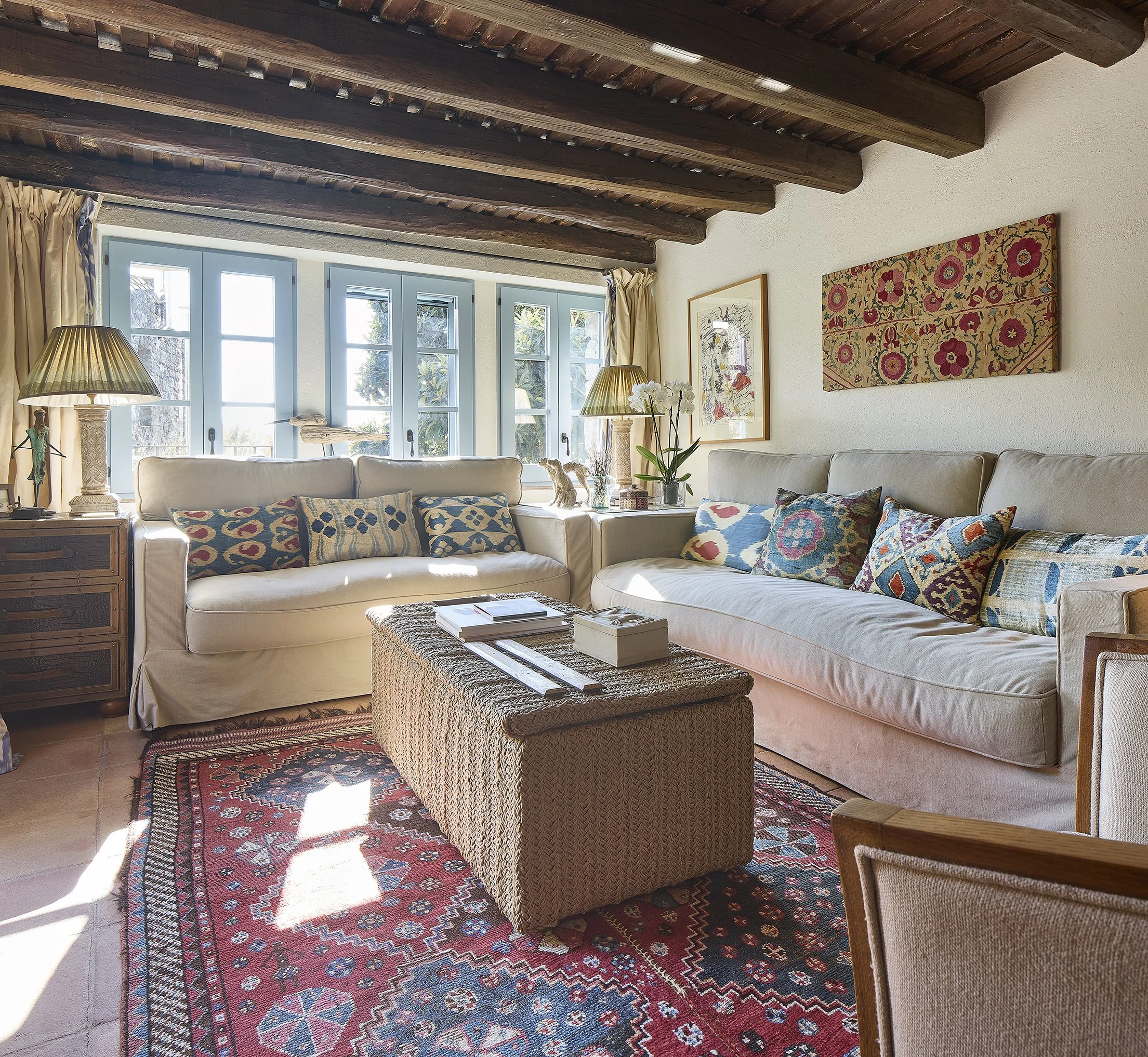 The main sitting room has two sofas and additional seating. Double doors open onto ample balcony with views overlooking the pool and garden.